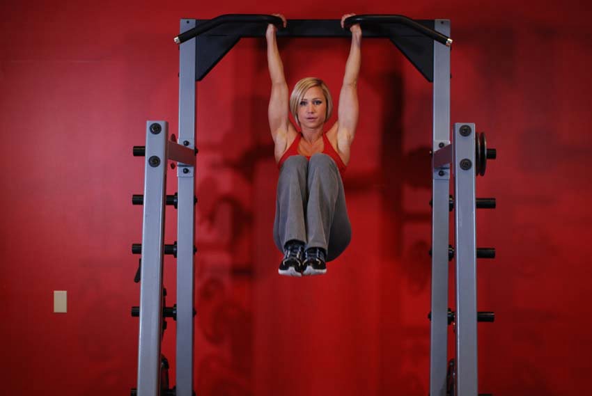 A more advanced version of this exercise is called toes to bar, where you will lift the legs in a straight position from hanging, up until they meet the bar above your hands. In the Garhammer the knees are bent and can be lifted directly up or to each side, so just play around with it. Aim to do 3 sets of 25-30 reps with a 2010 tempo.